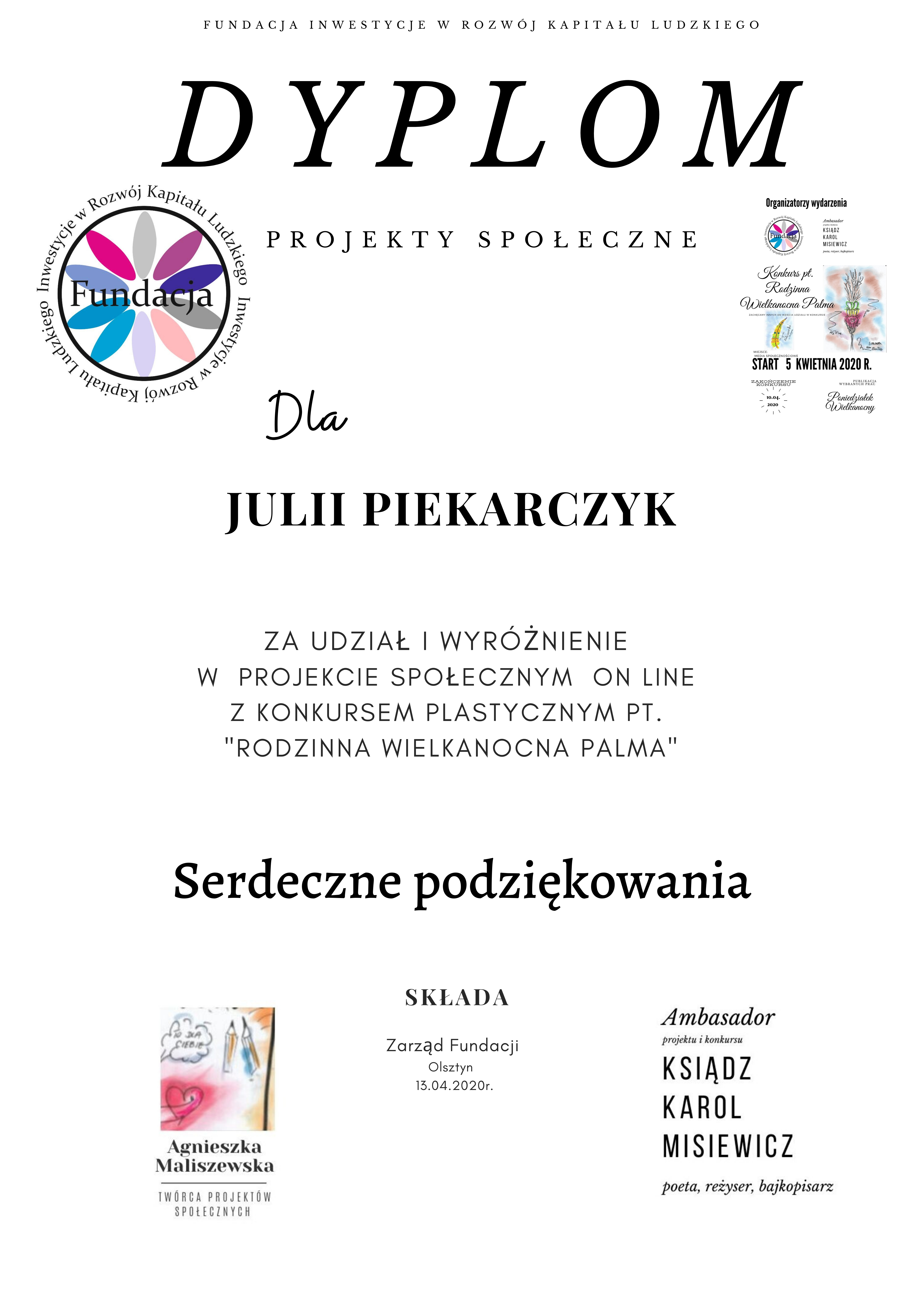 W Niedzielę Palmową tj. 5 kwietnia 2020 r., ogłoszony został Konkurs plastyczny przy projekcie społecznym on line pt.”Rodzinna Wielkanocna Palma”, organizowany przez Fundację Inwestycje w Rozwój Kapitału Ludzkiego wraz z Ambasadorem projektu i konkursu Księdzem Karolem Misiewiczem- reżyserem, poetą, bajkopisarzem.